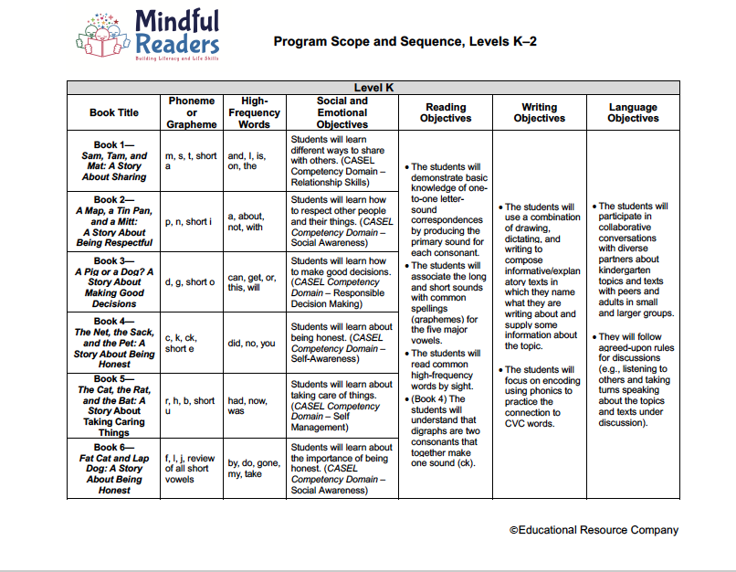 Mindful Readers is a comprehensive program developed for grades K–2 students. It integrates multi-modal phonics instruction with essential life skills through engaging text and systematic lessons. It is designed to develop students’ phonics skills and social-emotional intelligence through an incremental progression of reading, writing, language, and social-emotional learning objectives.